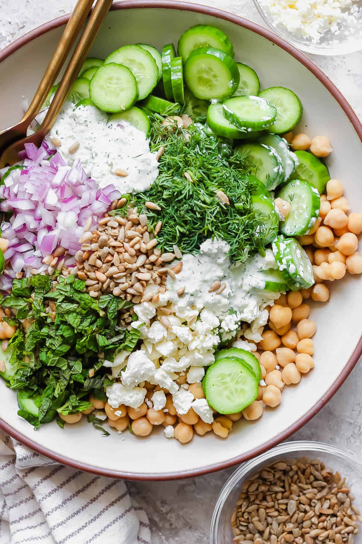 - English Cucumbers: These tend to have less moisture compared to standard cucumbers. Feel free to use regular cucumbers, but know that your salad might be a bit more moist.