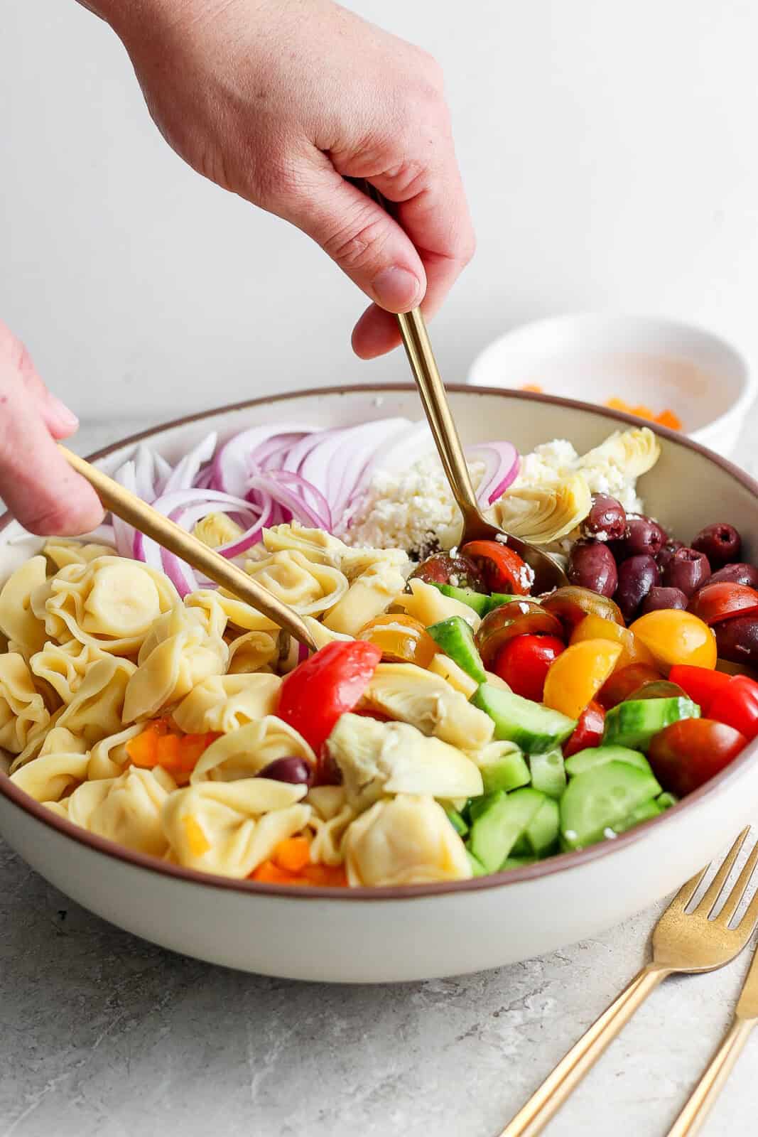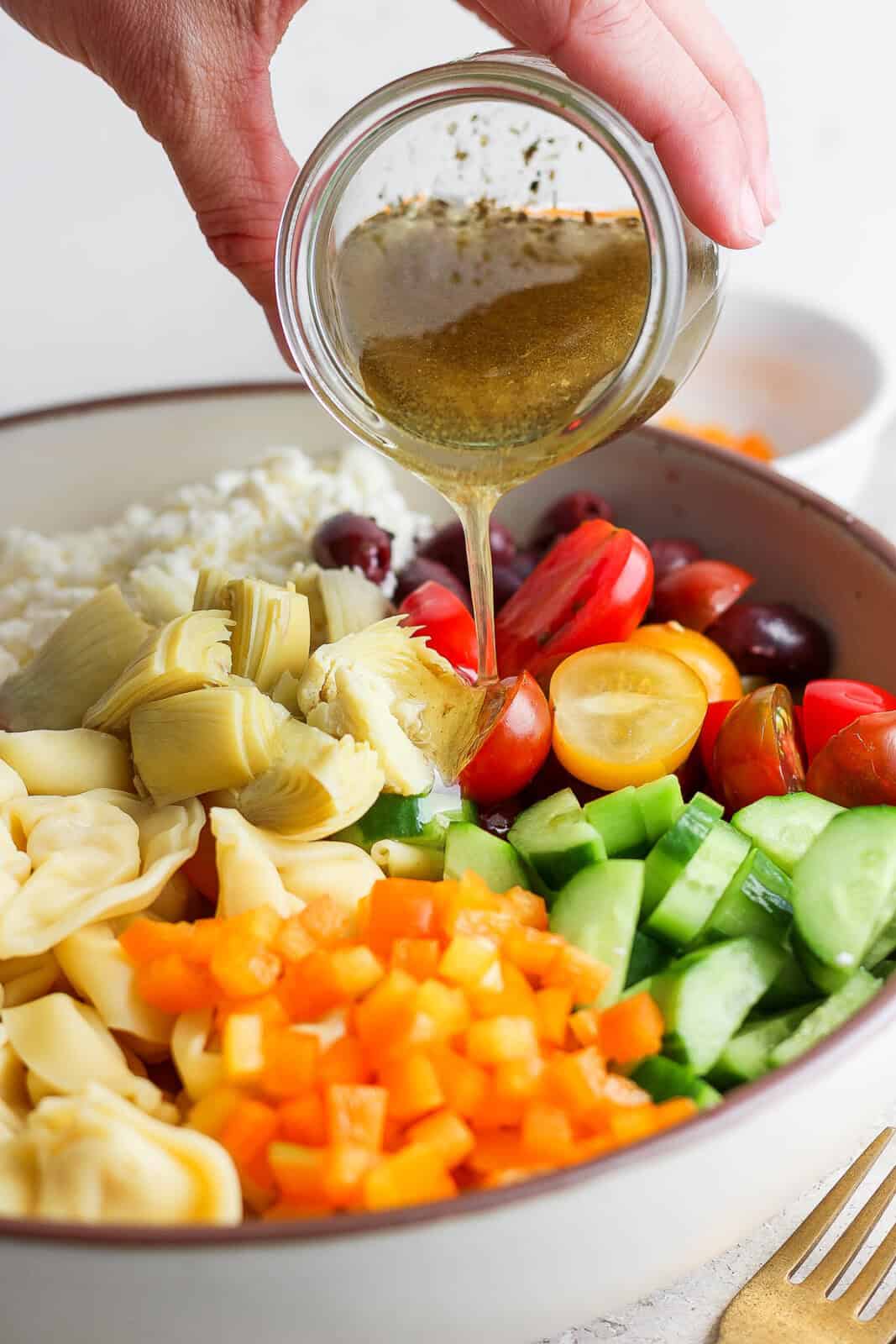 - Combine + Toss: add tortellini, feta cheese, red onion, cucumber, cherry tomatoes, bell pepper, artichokes and kalamata olives to a large bowl. Add dressing and toss to combine.