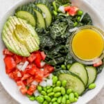 This light and refreshing summer salad is perfect for hot days when you don’t feel like cooking! It is fully of texture and the mustard dressing is a perfect pairing with the edamame and tomatoes!