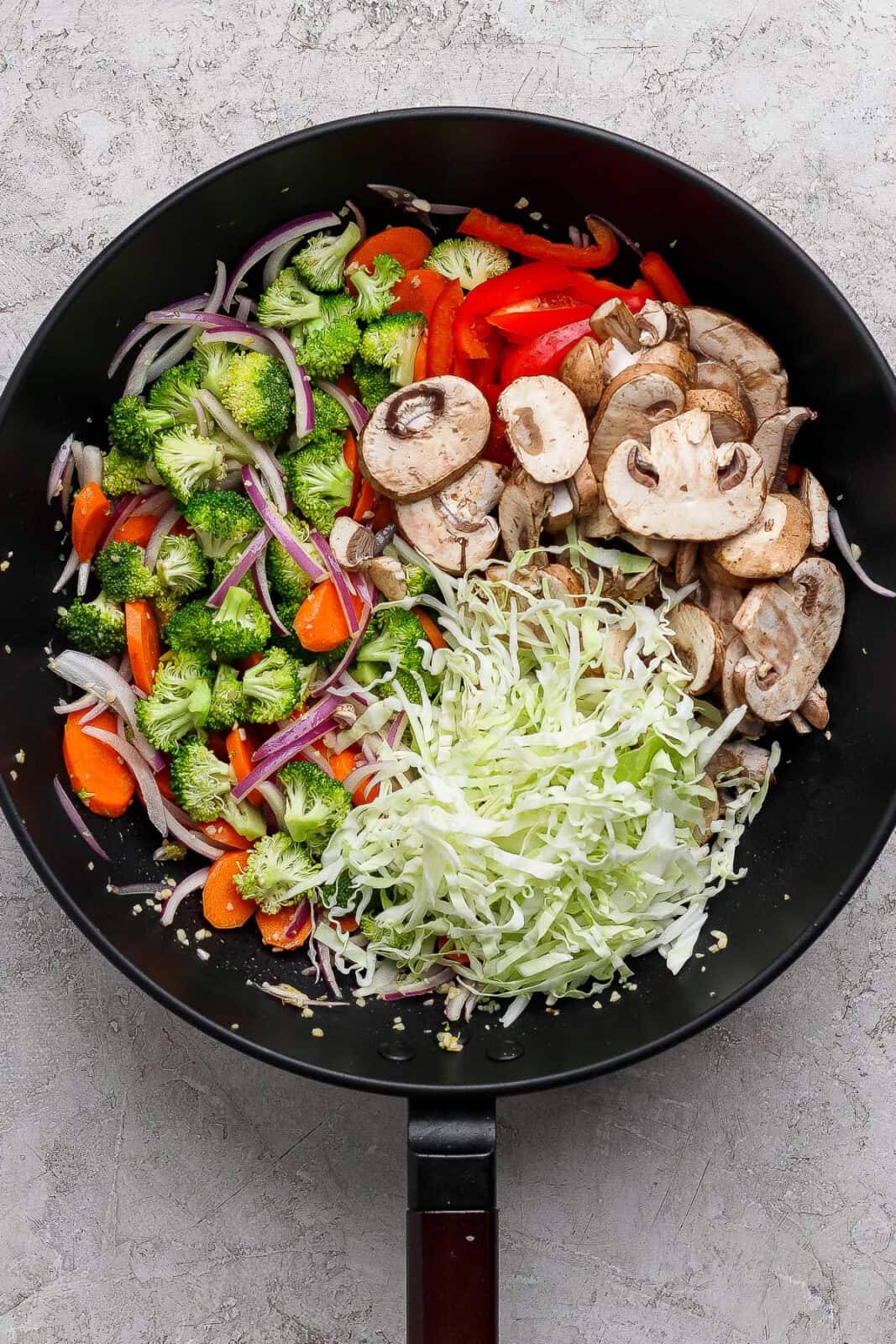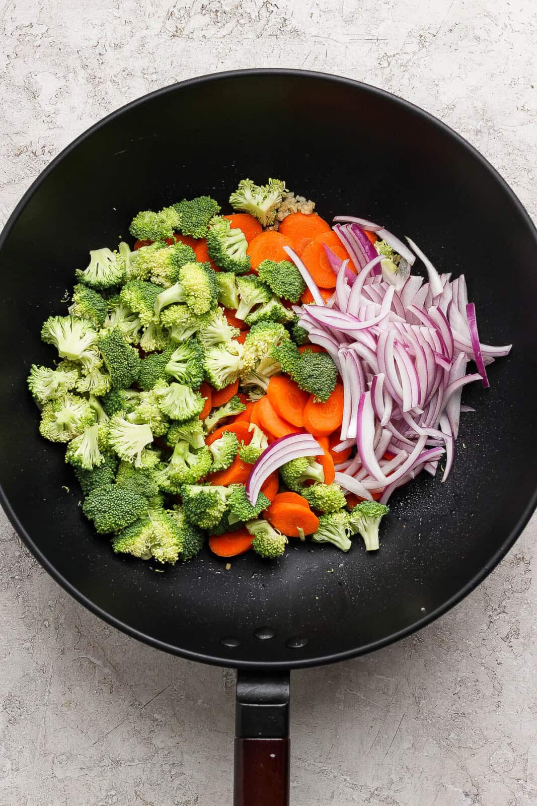 - Cook Veggies: Bring the skillet back to a medium-high heat and add another tablespoon of olive oil. Sautรฉ 1 tablespoon garlic for 30 seconds to 1 minute. Add the sliced carrots, broccoli, and red onion. Move around the pan to cook for 5 minutes. Add the rest of the veggies and continue cooking for another 3-5 minutes.