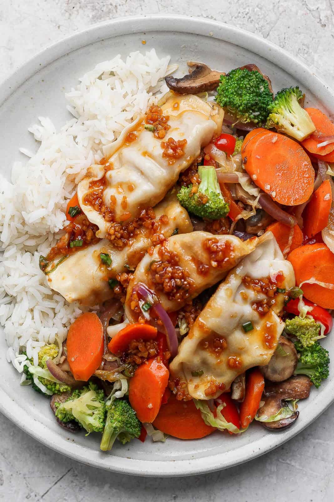 - Main Ingredients: frozen potstickers, fresh veggies, fluffy rice & a flavor-packed homemade sauce!