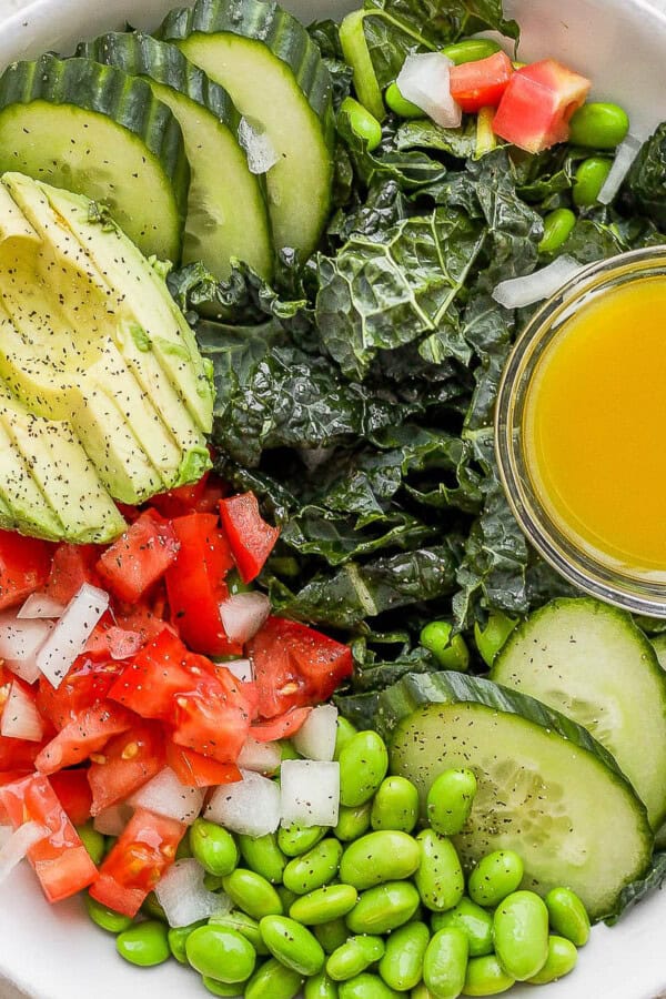 - fresh veggies – this is a kale salad so, of course, chopped kale was used as the base but feel free to swap it out for any other greens. The same goes for any of the salad ingredients.
