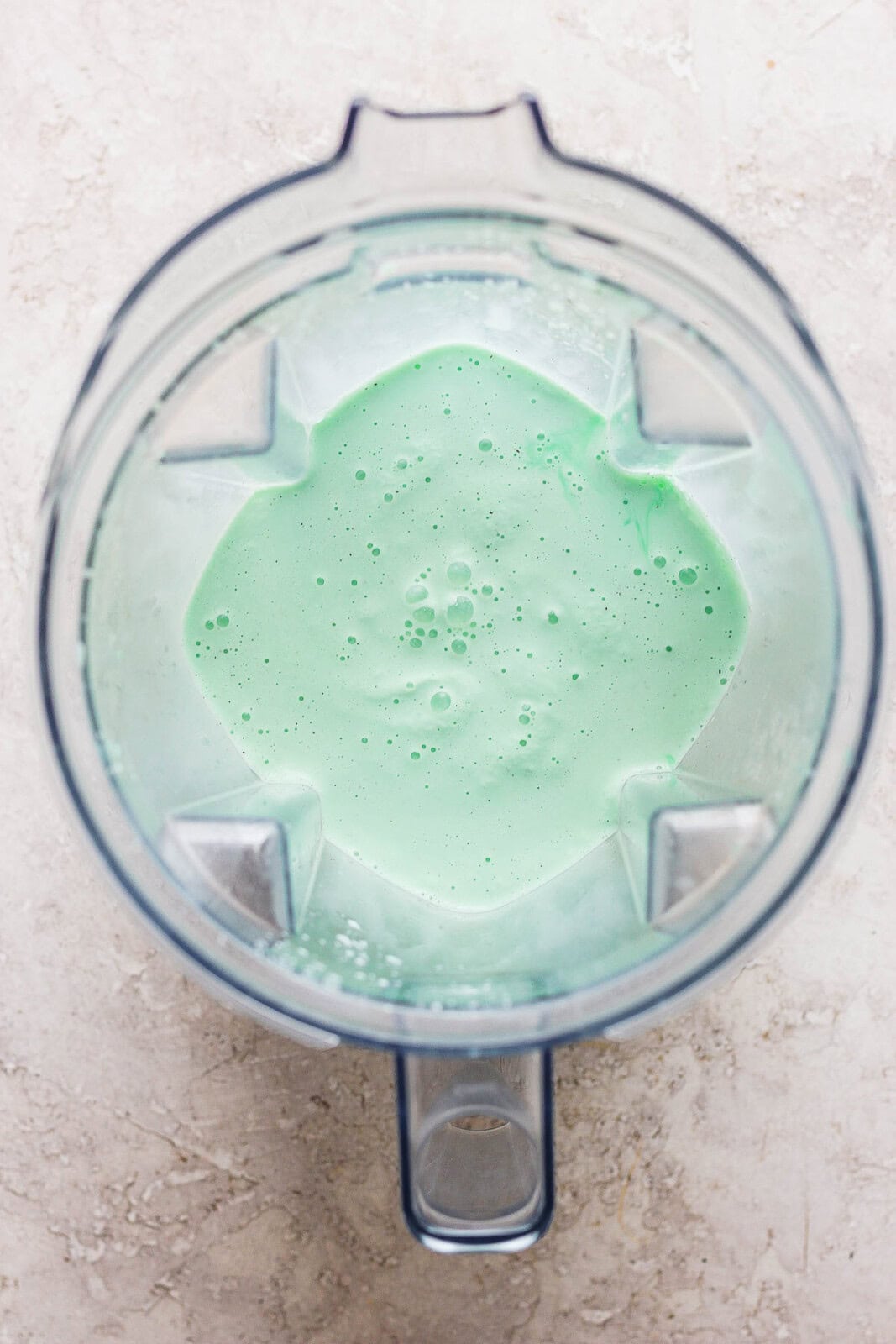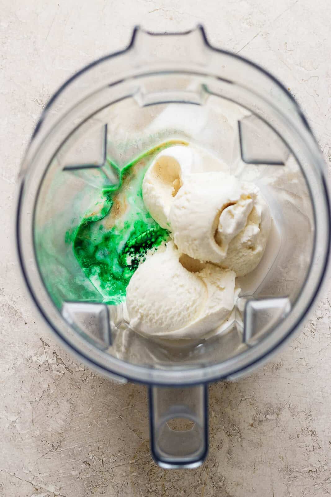 - Blender: In a high-powered blender, add 2 cups vanilla bean ice cream, ¾ cup unsweetened almond milk, ½ teaspoon vanilla extract, 5-10 drops green food coloring, and ¼ – ½ teaspoon mint extract. Blend until smooth.