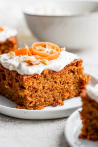 Only frost your gluten free carrot cake once the cake is completely cool. Gently place your hand on the top of the cake, and if you feel any warmth, don’t frost. This will let all of the moisture and steam escape, yielding a light and fluffy cake texture.